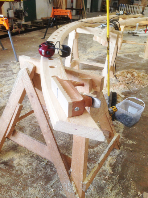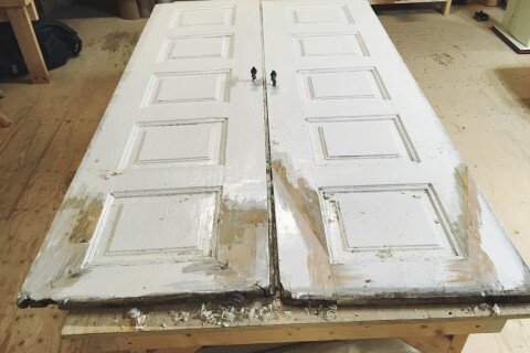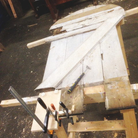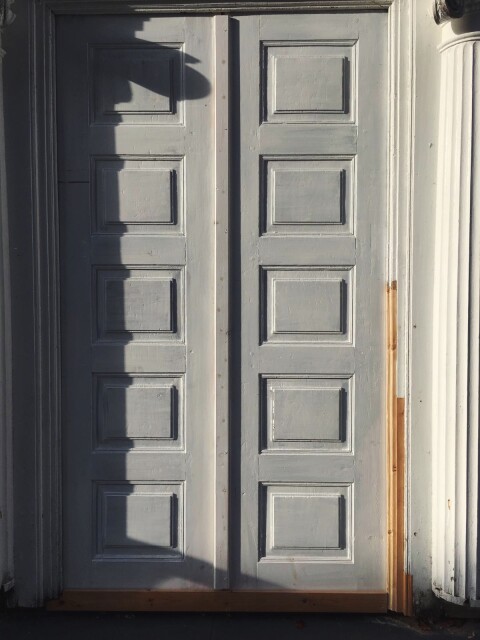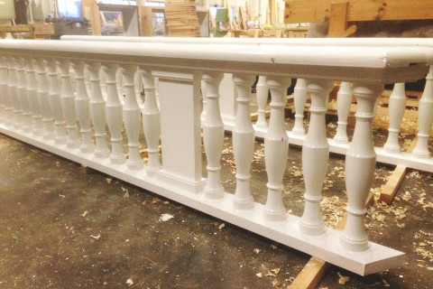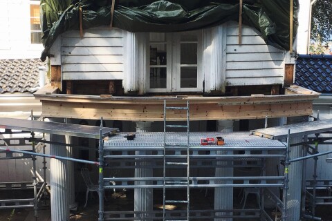 Balkongen over inngangspartiet settes i stand.