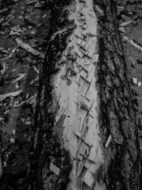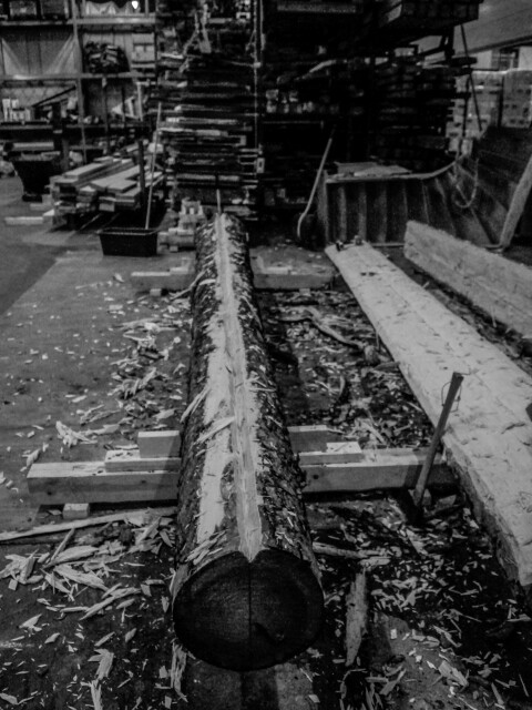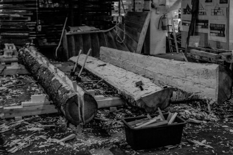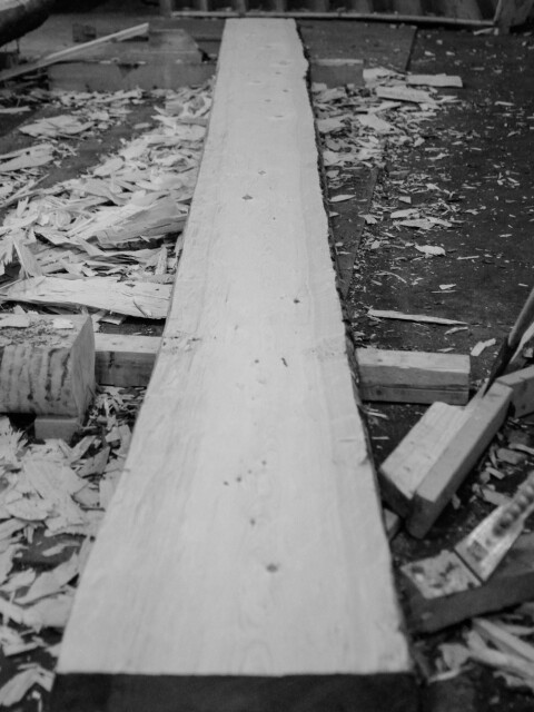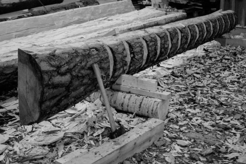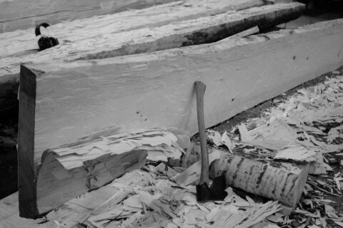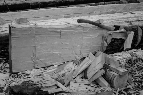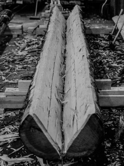 Kløyving og grovhugging på Fammestad. Materialet skal videre saltes og tørkes før det tilpasses og monteres som gulvbord på museet.
